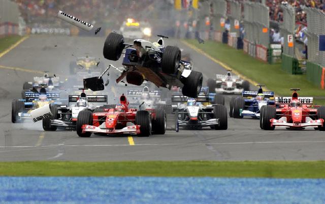 The race was only a few seconds old when we were to be hit by the first drama of the afternoon's amazing events. Ralf Schumacher was fastest away, but came across Barrichello's Ferrari in his path. The Williams was launched over the top of Barrichello's Ferrari, before landing on all four wheels in the gravel trap. Behind, there was a chain-reaction accident, which saw the cars of Heidfeld, Massa, Button, Fisichella, McNish and Olivier Panis eliminated along with Barrichello and Ralf Schumacher. The safety car was deployed as the marshals struggled to clear the wreckage, and after five laps, racing resumed.
