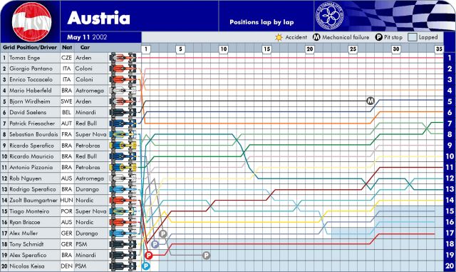 Bourdais made the most of his pole position to lead from Enge, as Rodrigo Sperafico passed Haberfeld for third into Turn 1. Bourdais led until a puncture forced him into the pits for a tyre-change on lap nine and he resumed at the tail of the field. This allowed Enge to open up a considerable lead, only for a fuel pump problem to force the leader into the pits and out of the race. Rodrigo Sperafico was now in the lead, and despite pressure from Haberfeld, he held off the Astromega driver to the flag. Mauricio's Red Bull car took third from Petrobras driver Antonio Pizzonia.