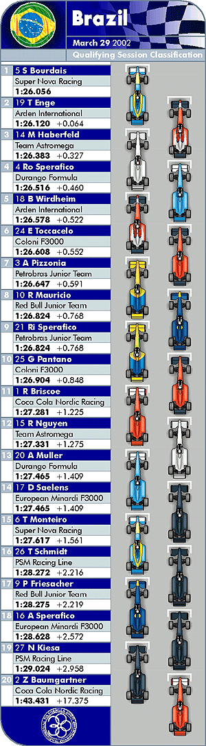 Sebastien Bourdais, a veteran of several F3000 seasons was fastest in qualifying, and placed his SuperNova Racing machine on pole position. Tomas Enge, the Arden driver who had a spell with the Prost Grand Prix team at the end of last season, was second fastest, just 0.06seconds slower than the Frenchman. Another F3000 regular, the former British Formula 3 driver Mario Haberfeld, lined up third, ahead of Rodrigo Sperafico. Bjorn Wirdheim, who may be familiar to British fans following a stint in the Formula Palmer Audi Championship several years ago, was the top rookie in fifth. The Coloni driver Enrico Toccacelo lined up in sixth. Antonio Pizzonia, Ricardo Mauricio, Ricardo Sperafico and Giorgio Pantano completed the top ten - all were within one second of the pole position time.